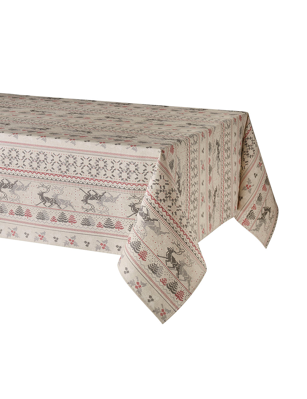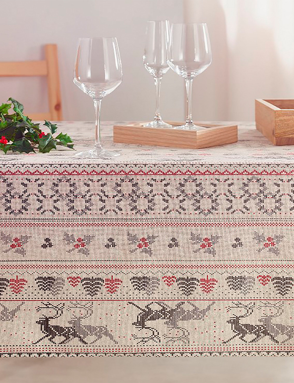 Nuestro mantel SOLVI es un protagonista destacado en nuestra línea de manteles diseñados para la temporada festiva. Con un diseño que captura la magia y el espíritu de las celebraciones navideñas, te sumergirá en recuerdos de reuniones familiares y la calidez de las noches de Navidad.