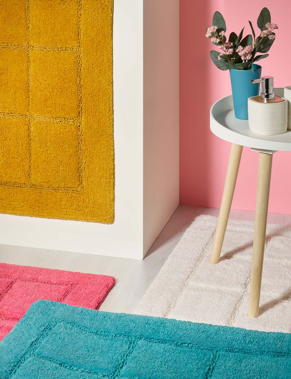 Disponible en cuatro elegantes colores: turquesa, blanco, mostaza y gresa, la alfombra Basai no solo es funcional sino también un complemento decorativo que se adapta a cualquier estilo de baño. Su tacto suave garantiza una sensación agradable y confortable para los pies, evitando resbalones y el contacto con el frío del suelo al salir de la ducha.