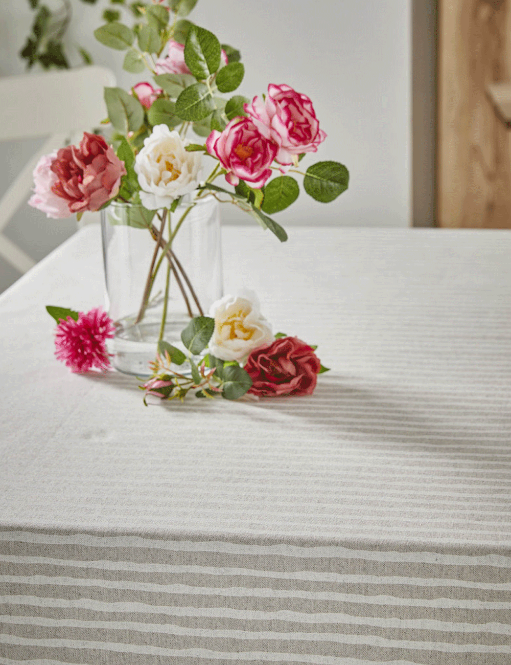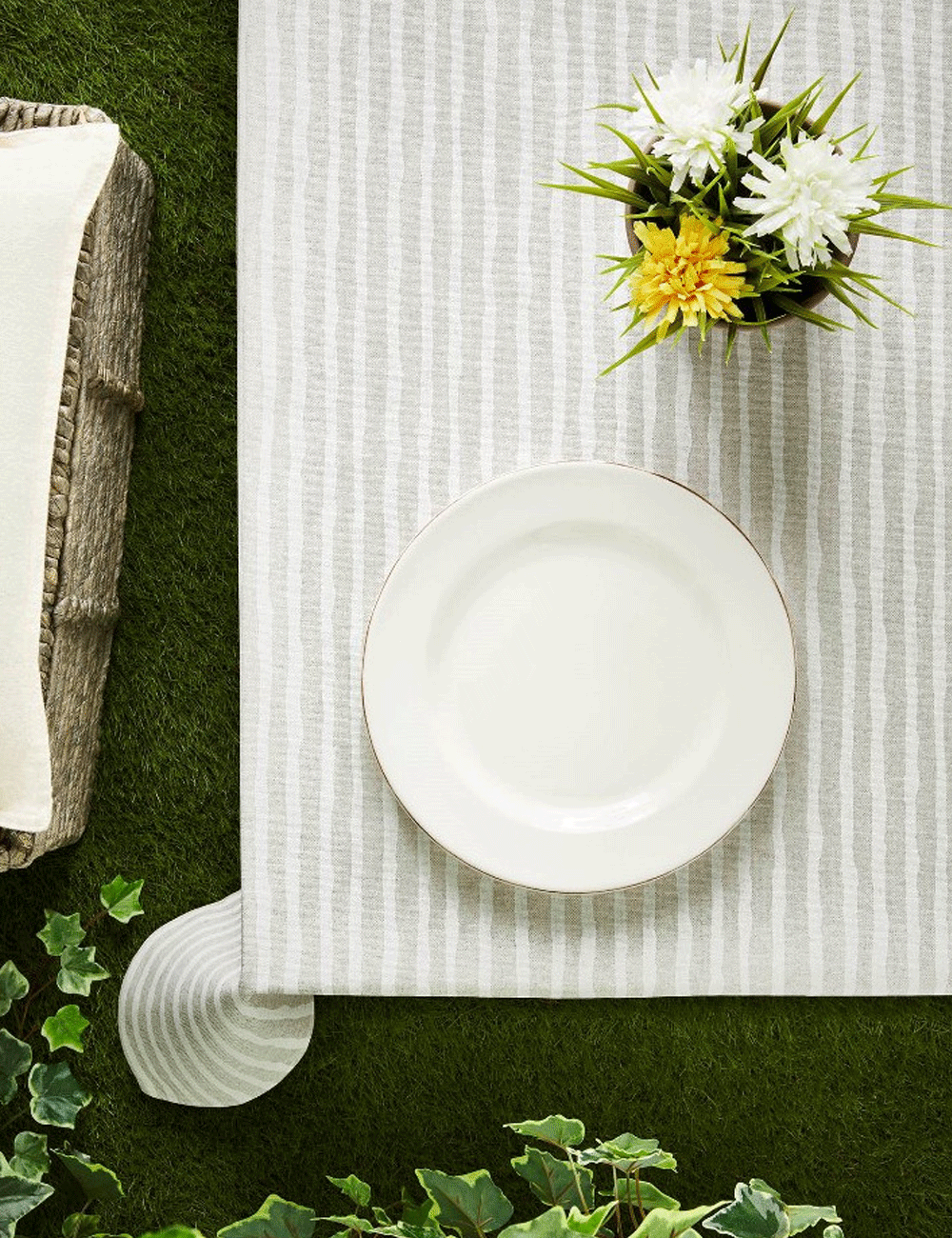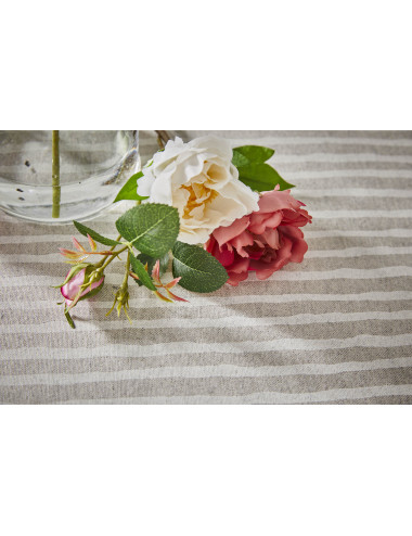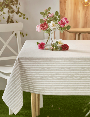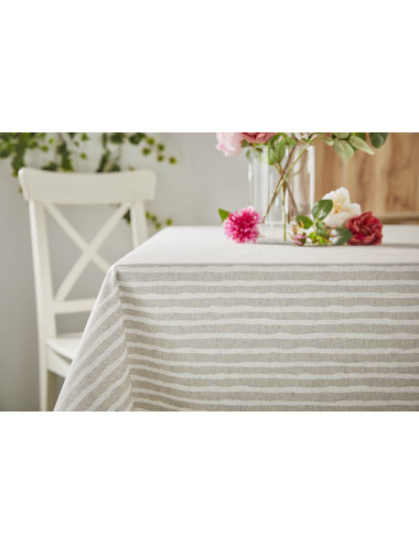 Mantel de mesa antimanchas resinado con doble capa de resina acrílica para facilitar su limpieza. Presenta un estampado de rayas irregulares y está confeccionado con tejido natural imitación de lino (80% algodón y 20% poliéster, 207 gr/m2), lo que le confiere un acabado fresco y sencillo. Es perfecto para la temporada de primavera y verano.